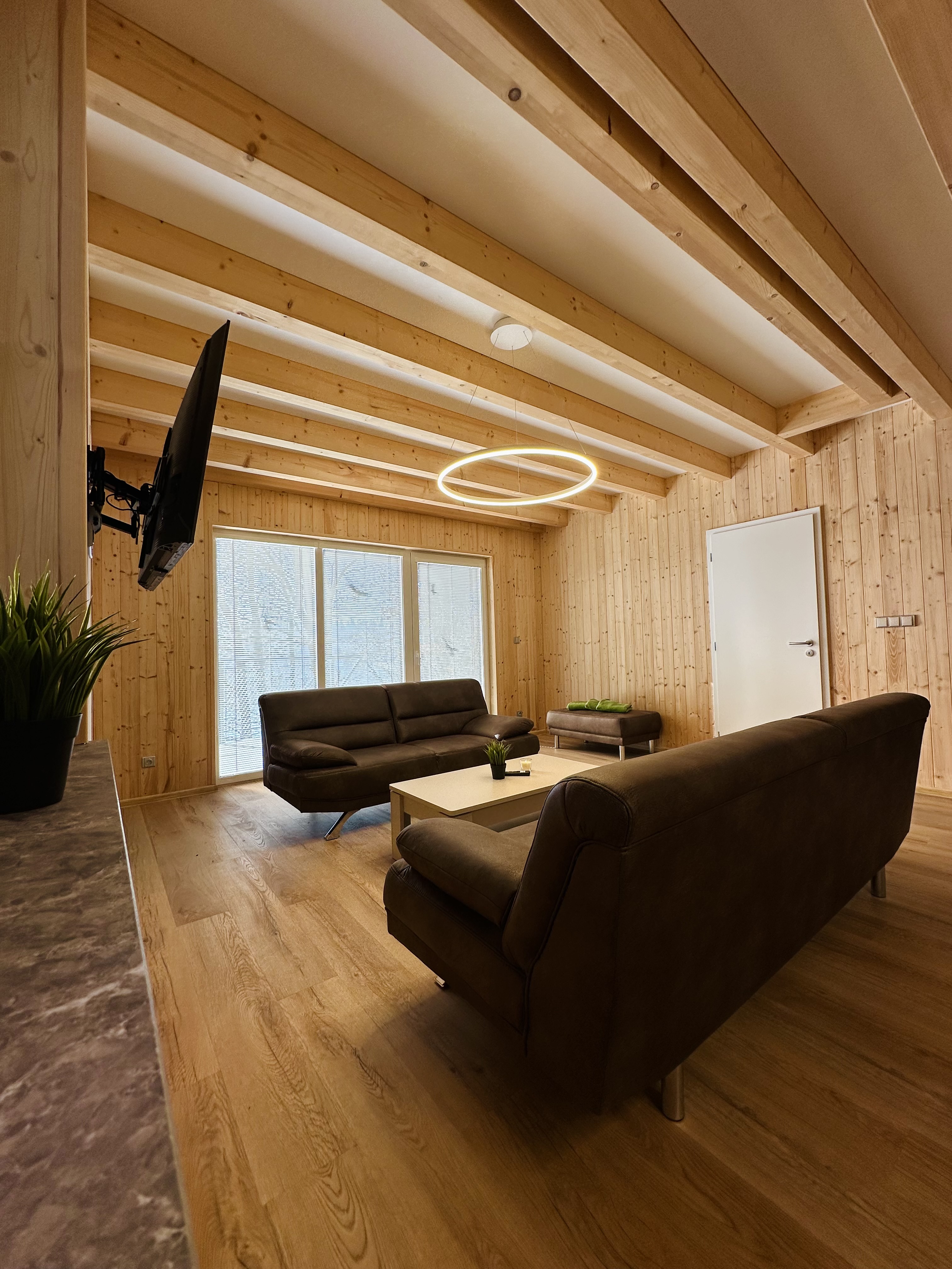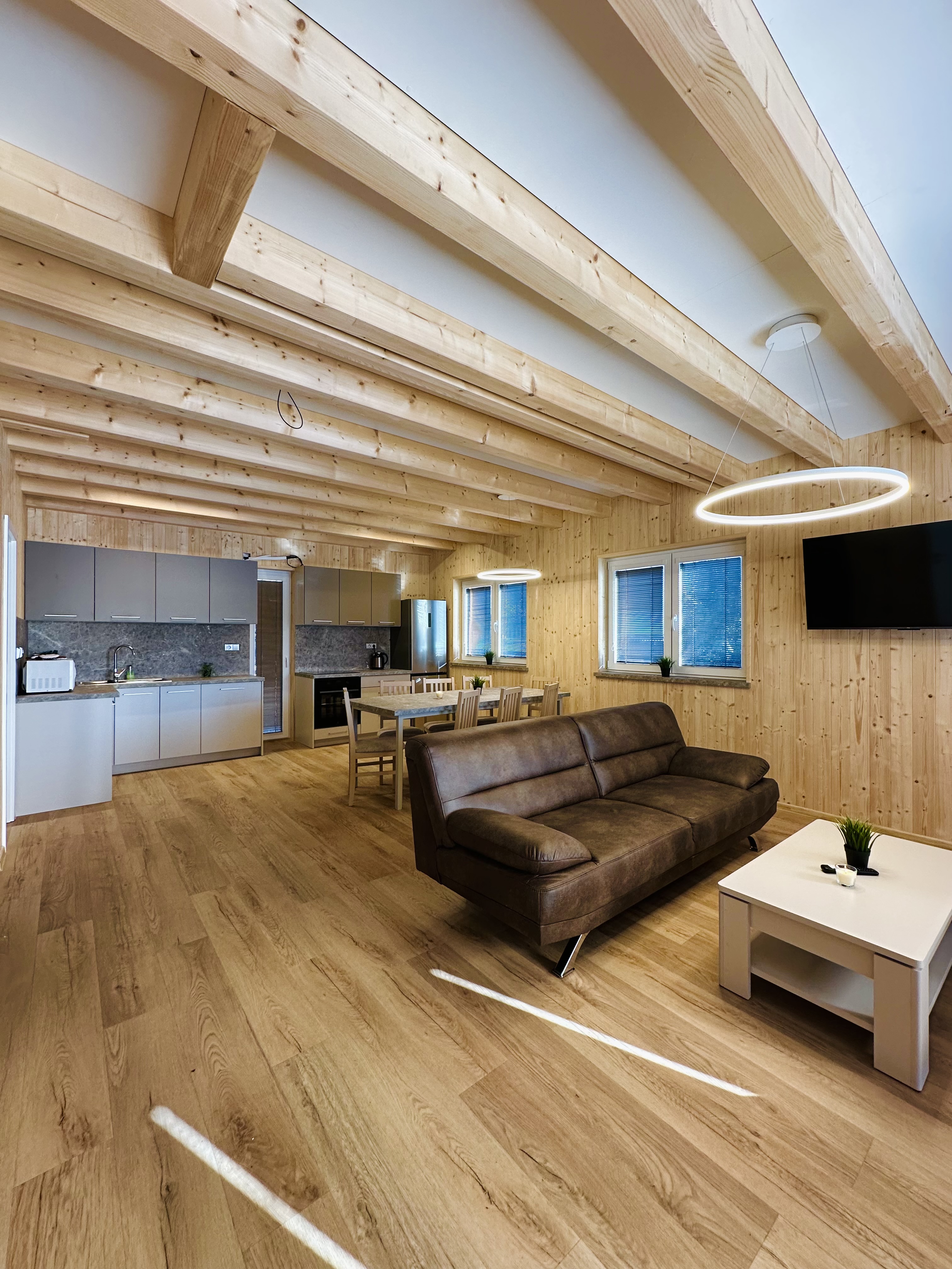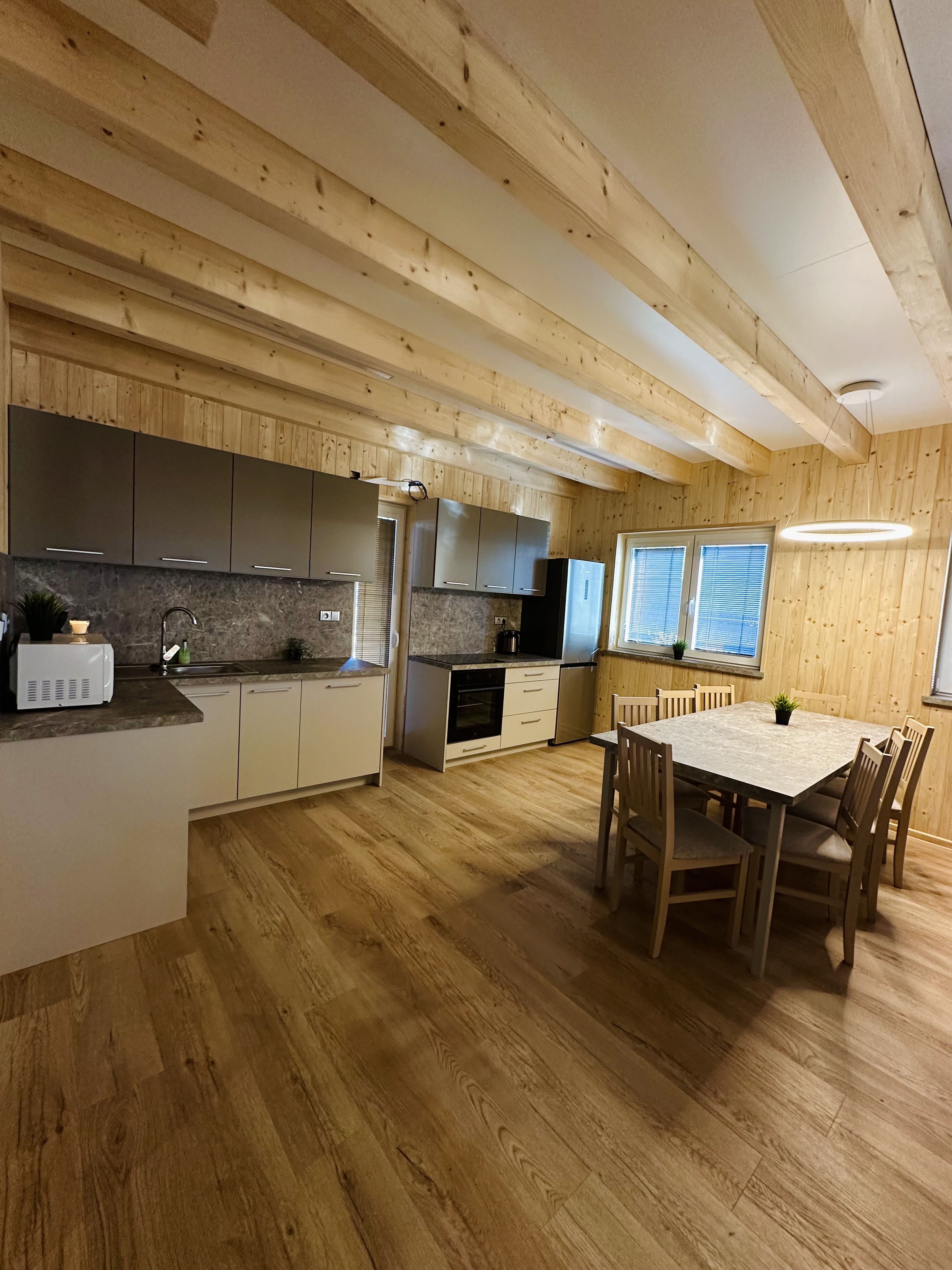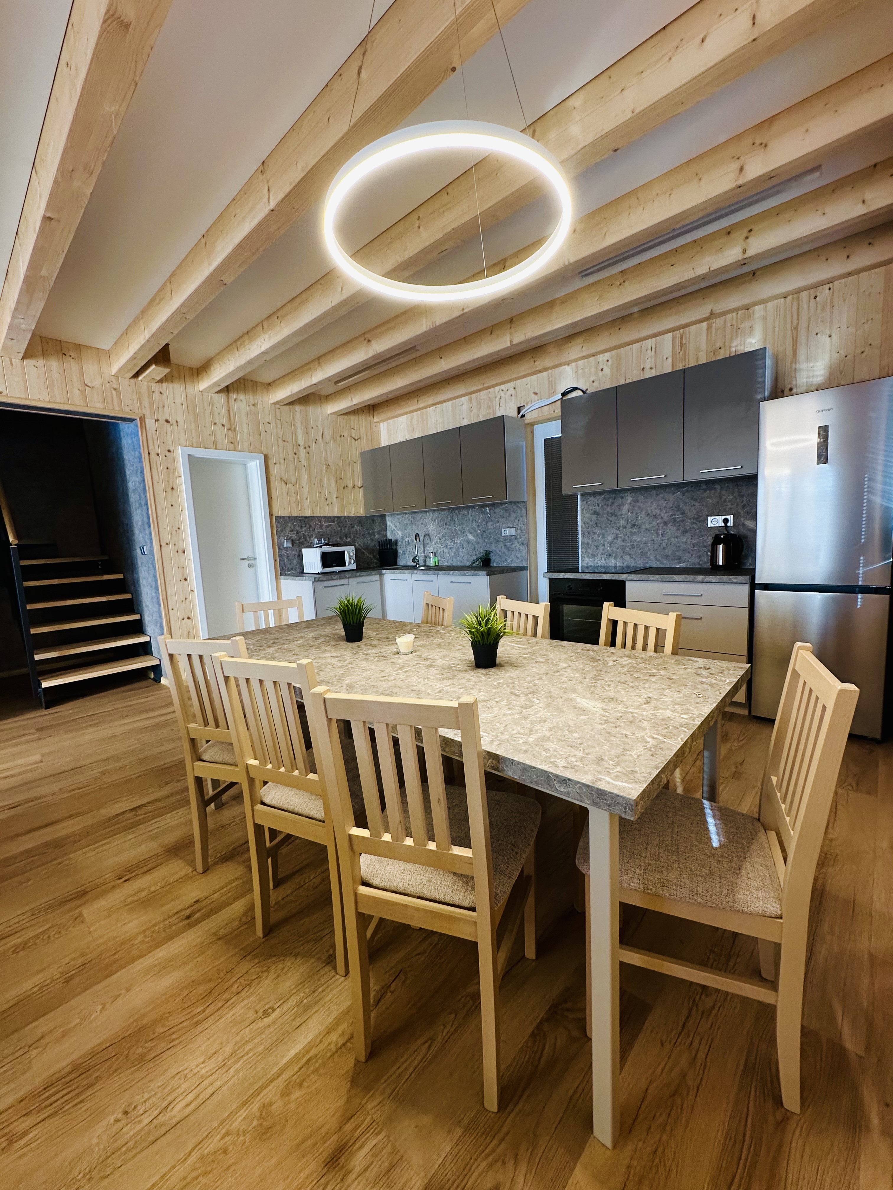 - 1x obývací pokoj - smart TV, vestavěné skříně, sedací souprava, jídelní stůl, 8 židlí